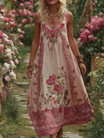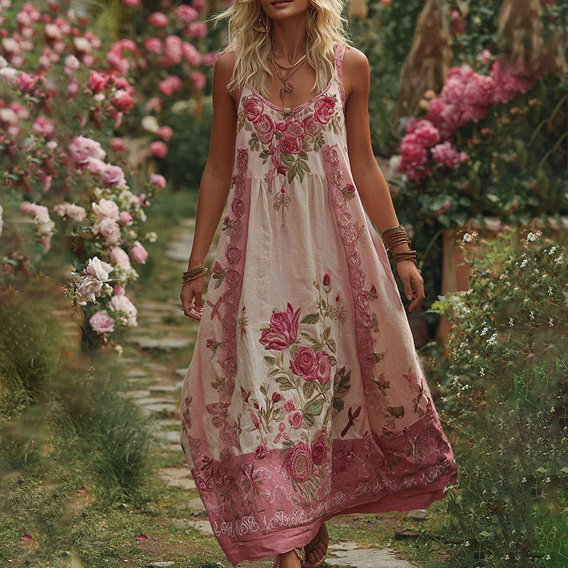 Women's Vintage Floral Embroidery V Neck Tank Midi Dress